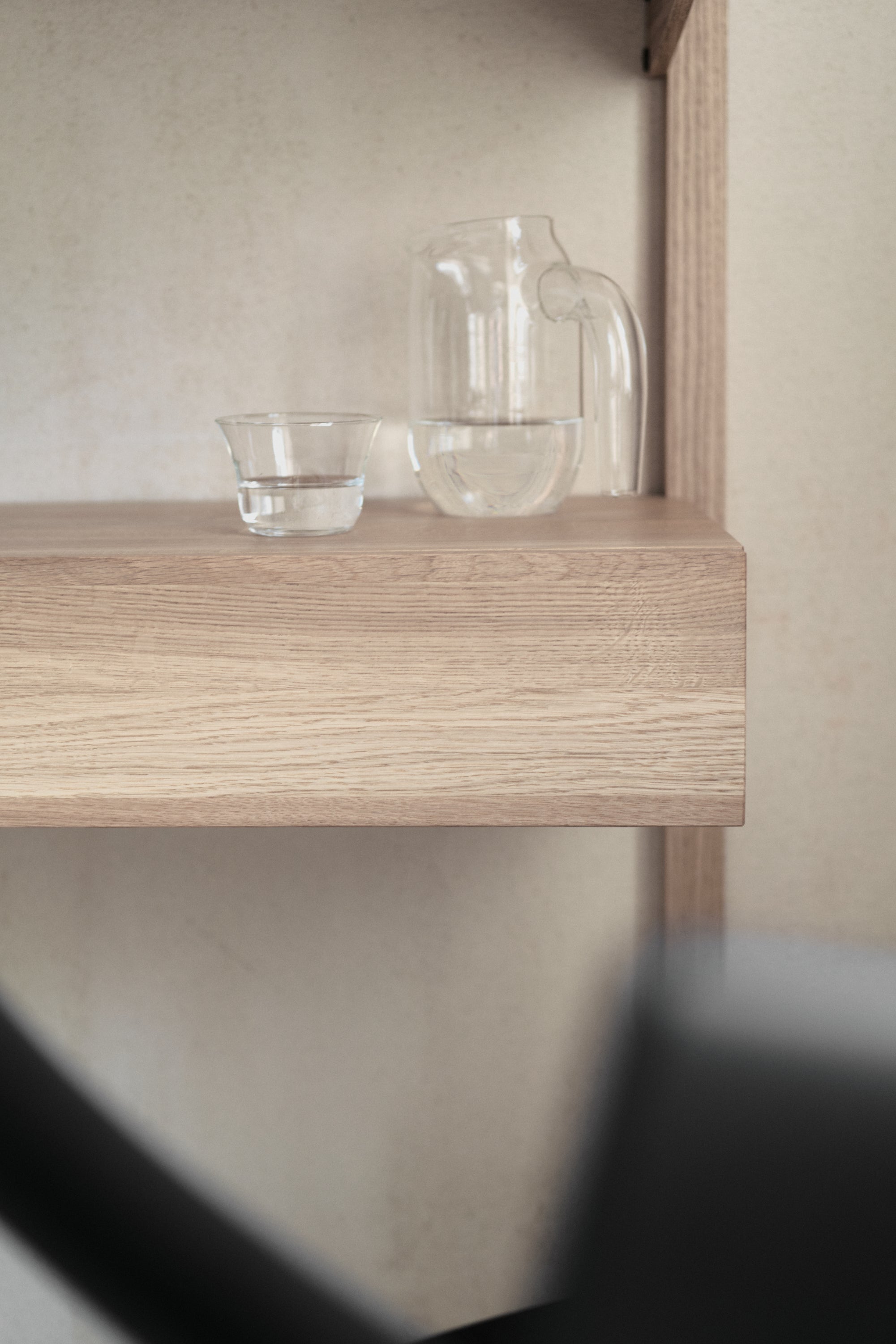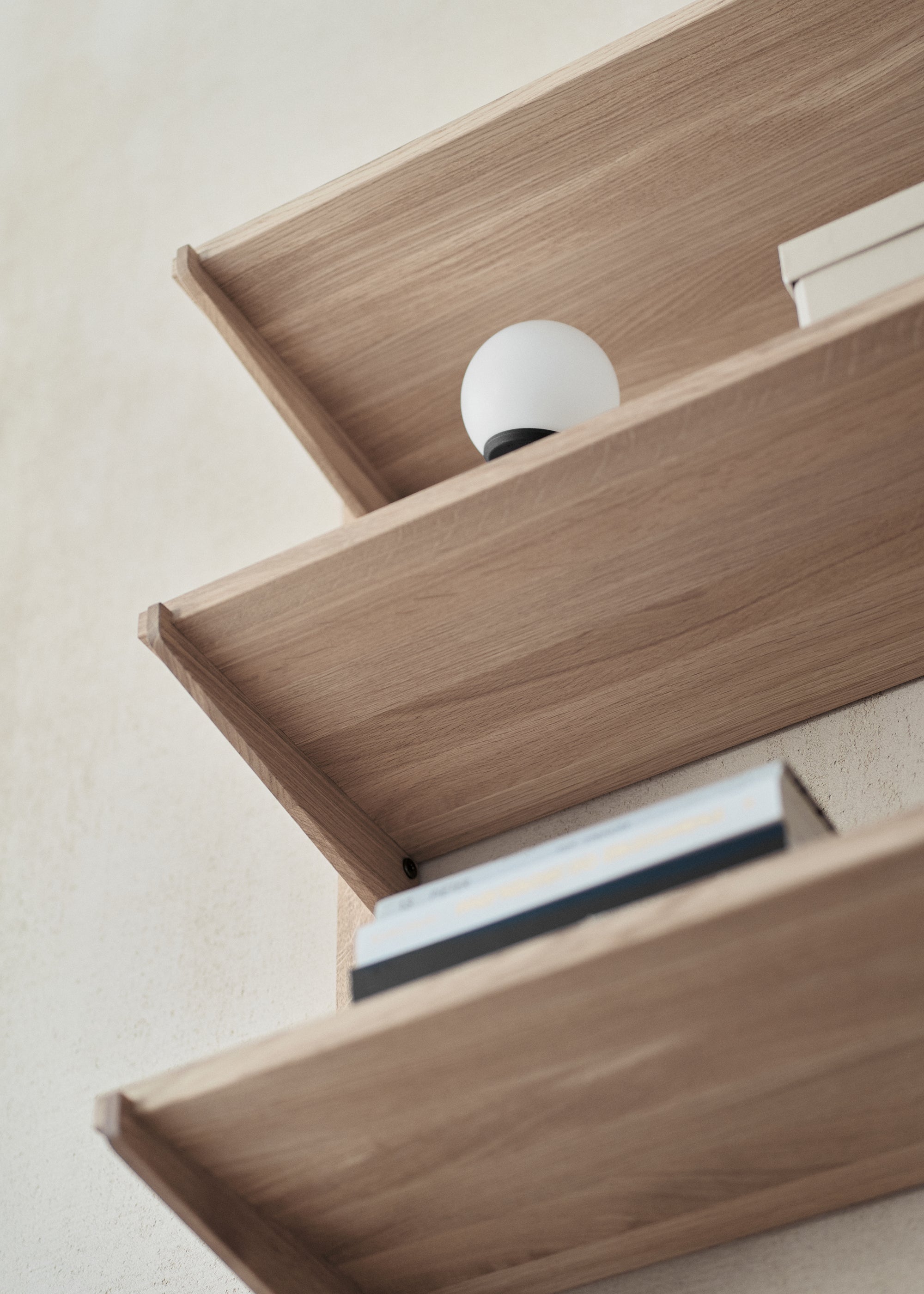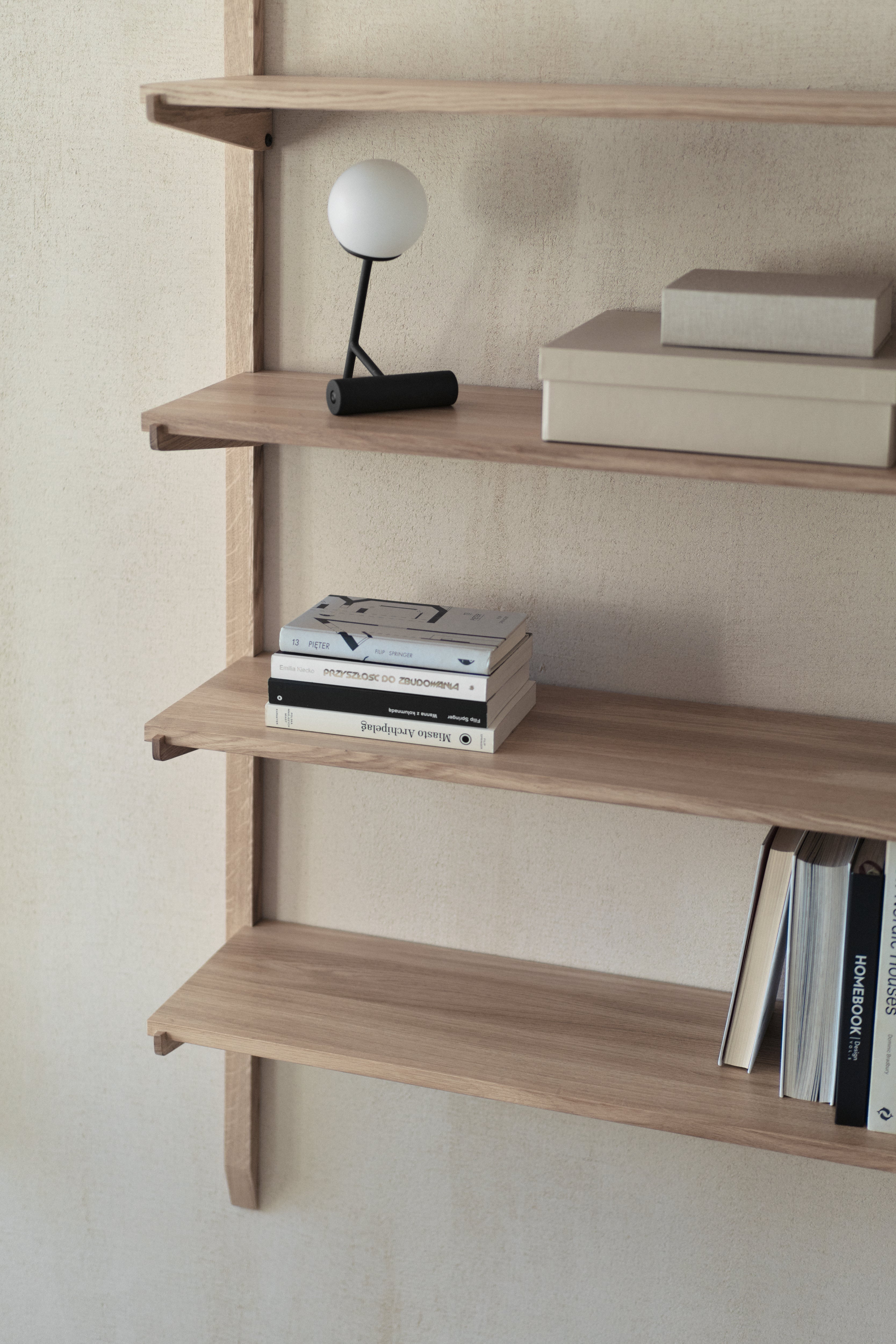 Das Design ist inspiriert von „noki“ - den freiliegenden Traufen der traditionellen japanischen Architektur. In Anlehnung an ihre rhythmische Struktur bilden die Regale ein klares, modulares System, das leicht an verschiedene Bedürfnisse angepasst werden kann.
