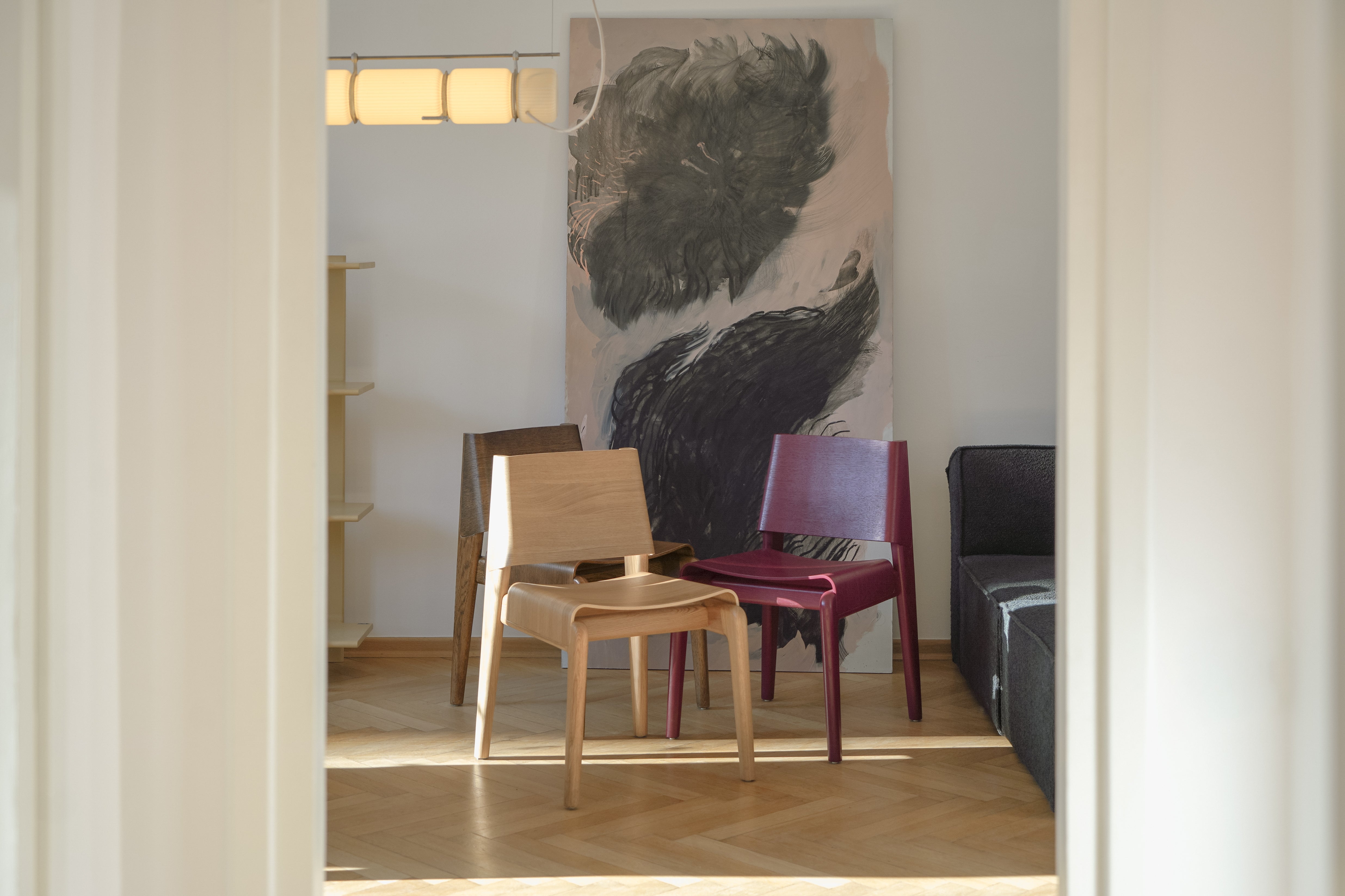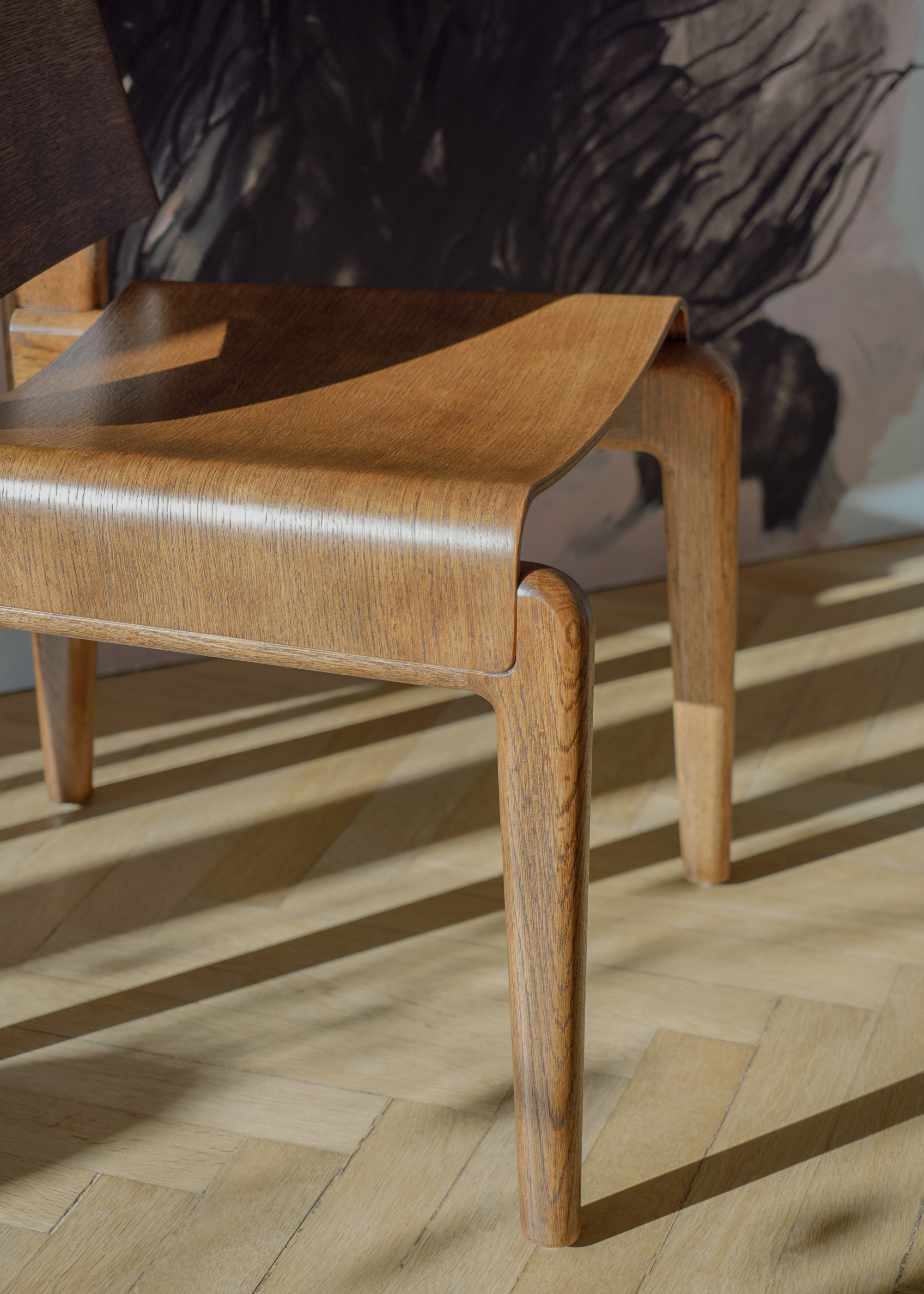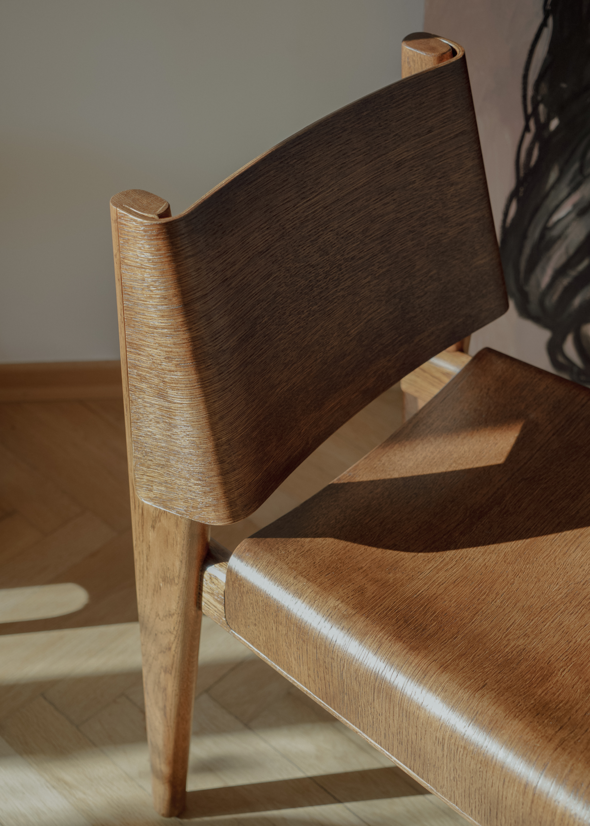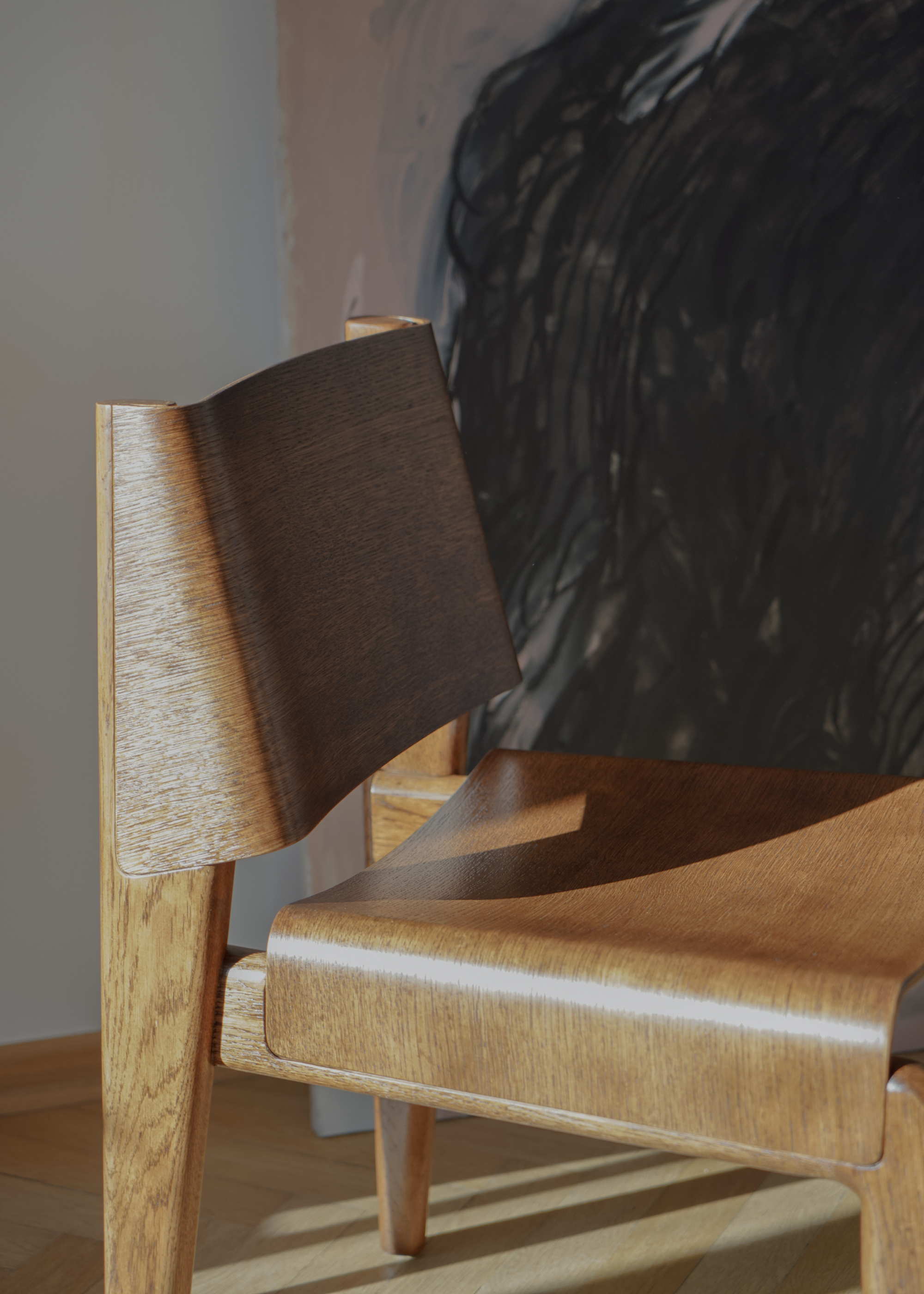 Les courbes douces du contreplaqué apportent une souplesse naturelle à la silhouette, tandis que la structure en chêne offre stabilité et solidité tout en restant visuellement discrète. UNDIA introduit dans l’espace une ligne calme et harmonieuse présente, mais jamais intrusive.
