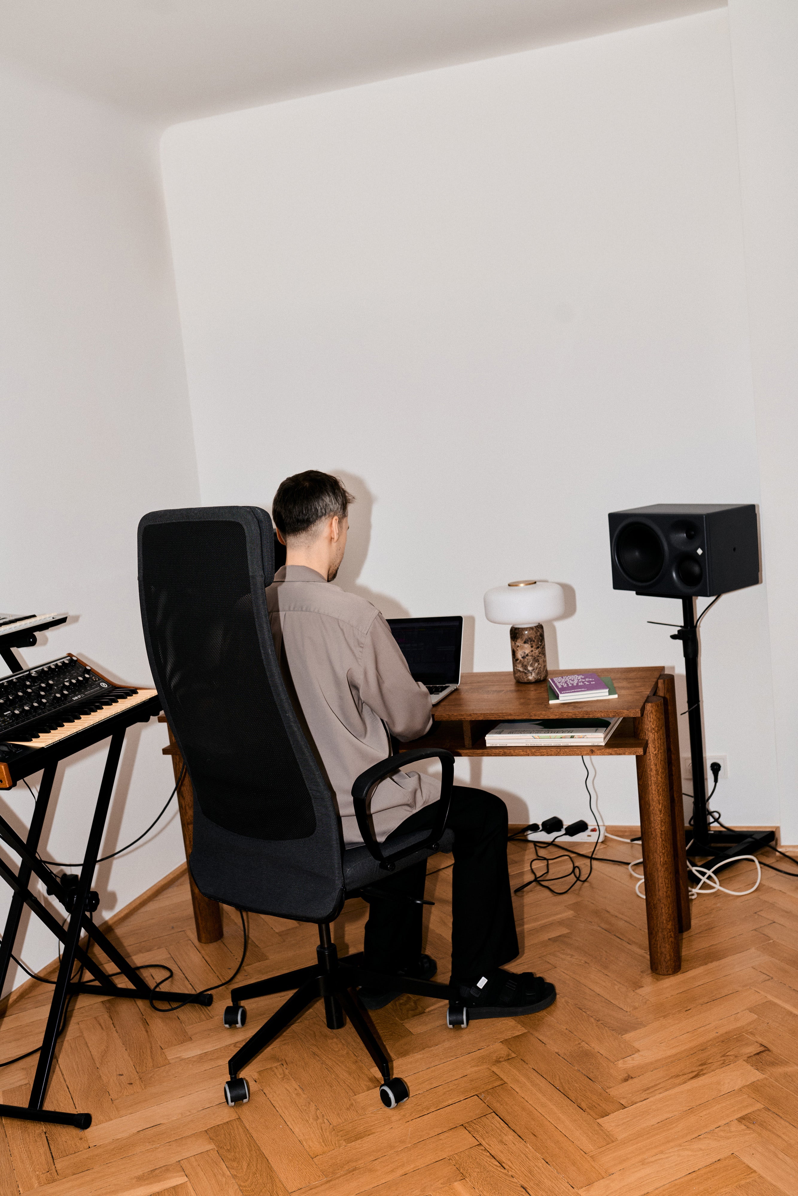 Głównie to praca przy biurku, ale lubię wypełnić przestrzeń muzyką i często chodzę po