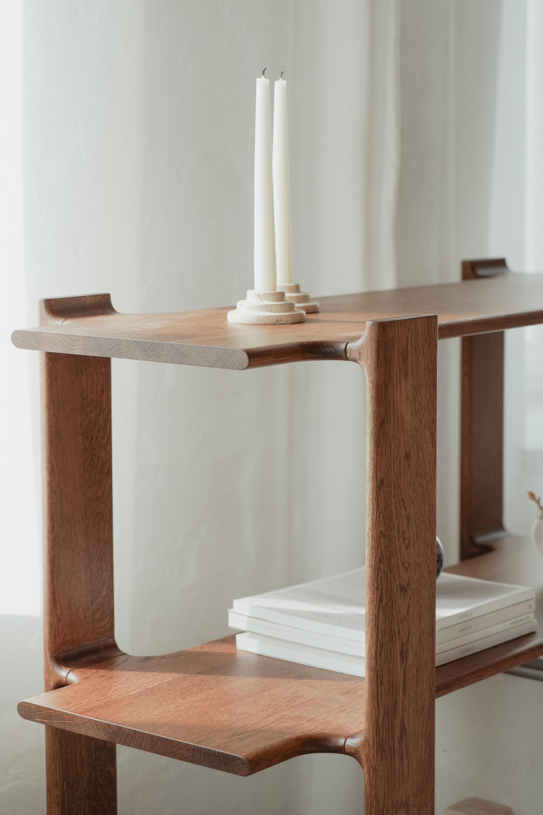 Charakterystycznym elementem regału LIGO są jego łączenia – miękkie, płynne spotkania elementów pionowych i poziomych. To, co mogłoby być zwykłą łącznością, staje się skulpturalnym znakiem rozpoznawczym: cichym, precyzyjnym i głęboko przemyślanym.