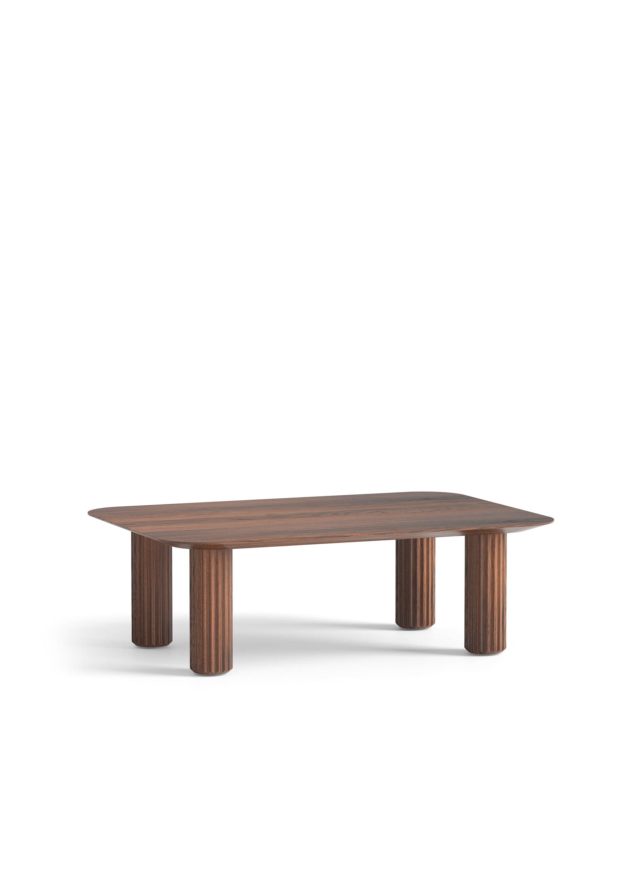 The tabletop features a gently rounded edge that appears visually thinner than it truly is — an effect achieved through angled milling on the underside. This design detail subtly highlights the sculptural elegance of the fluted legs. The ribbed motif recalls the form of a classical architectural column, referencing the ancient role of pillars as structural and symbolic elements.